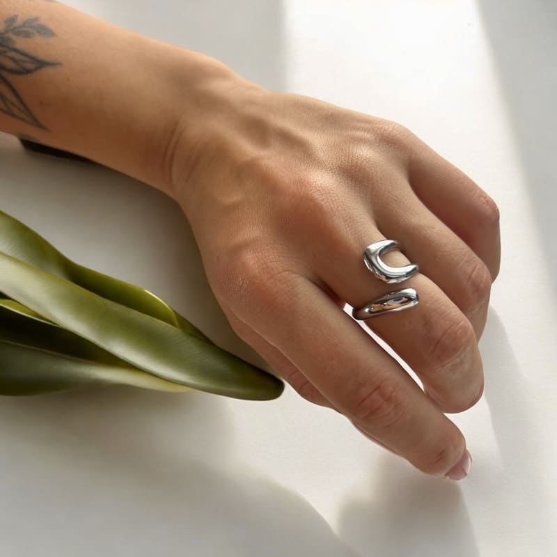 Jego delikatna forma idealnie owija się wokół palca, tworząc efekt smukłości i dodając dłoniom wyrafinowania.