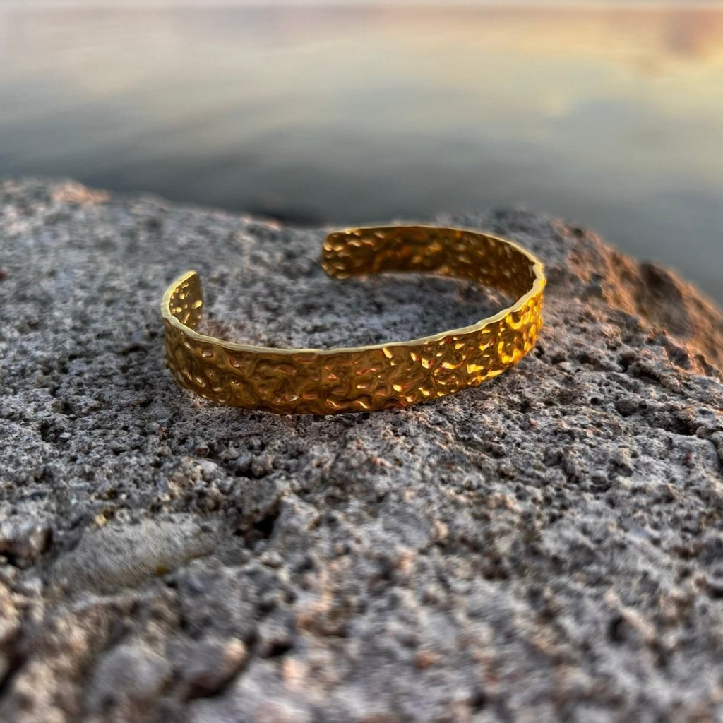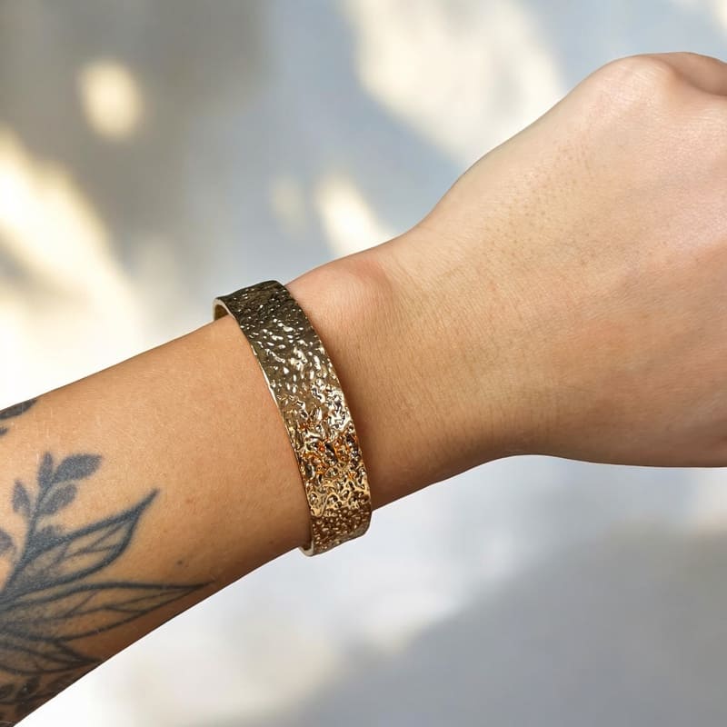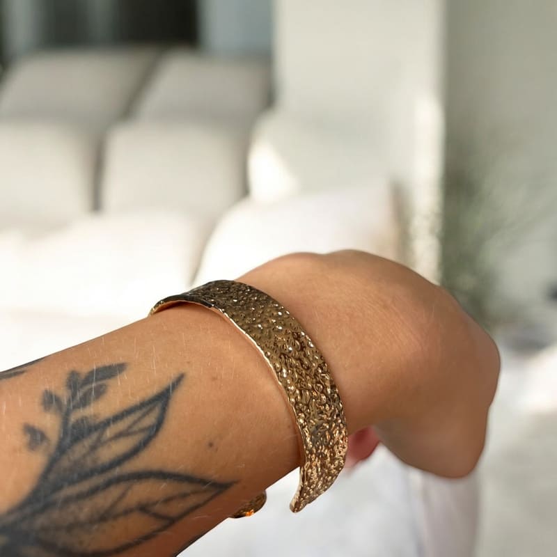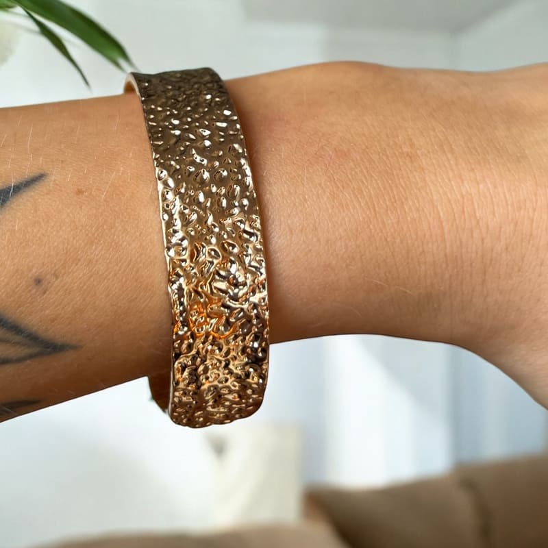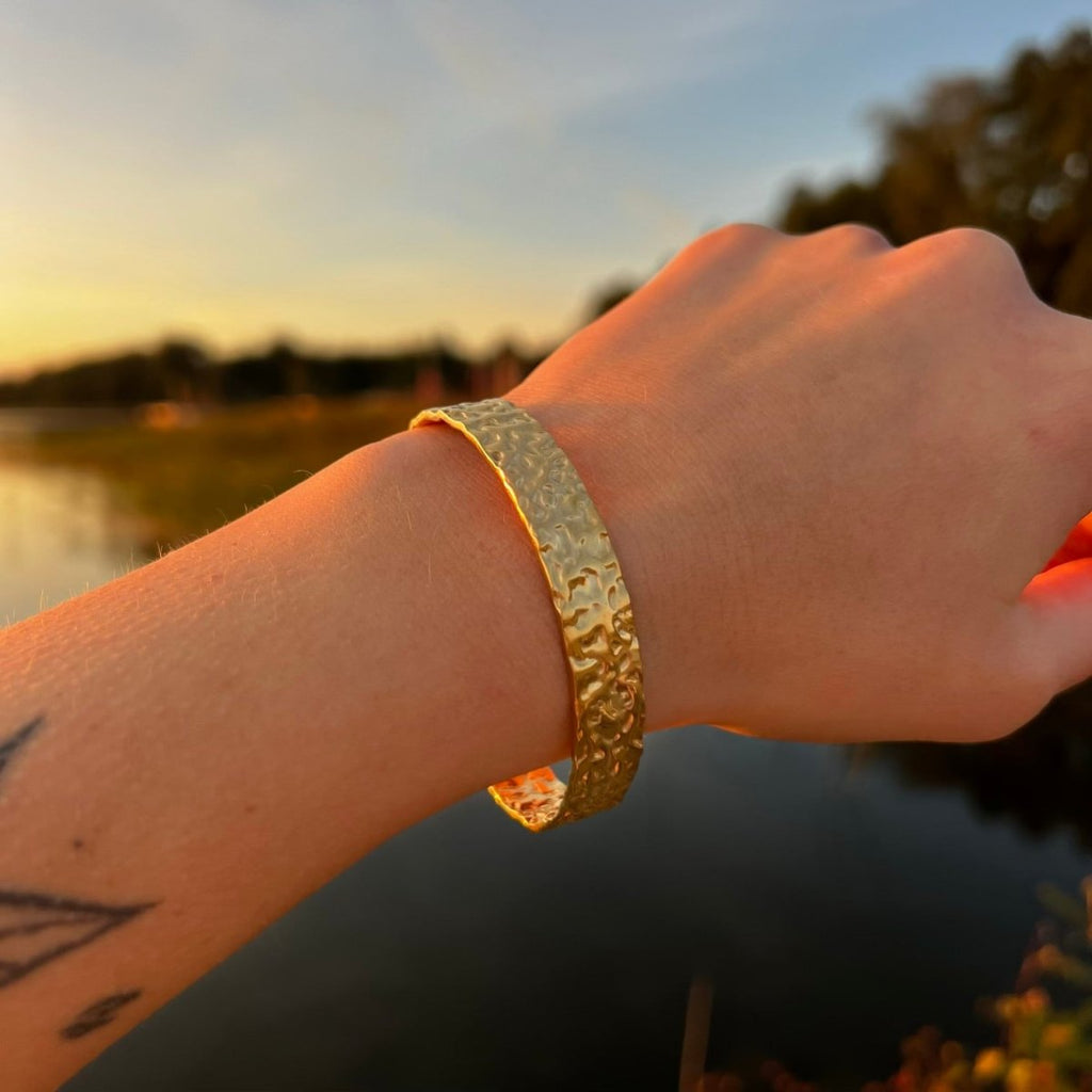 Ta drobno młotkowana regulowana bransoletka wyróżnia się delikatną teksturą, która nadaje jej unikalnego, artystycznego charakteru.
