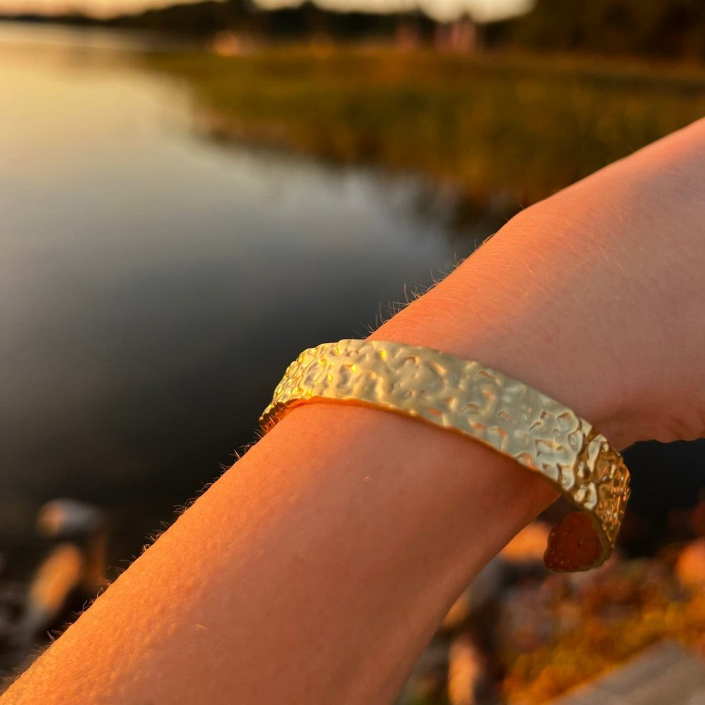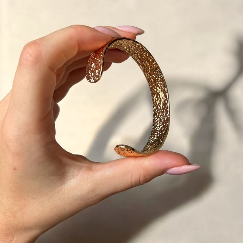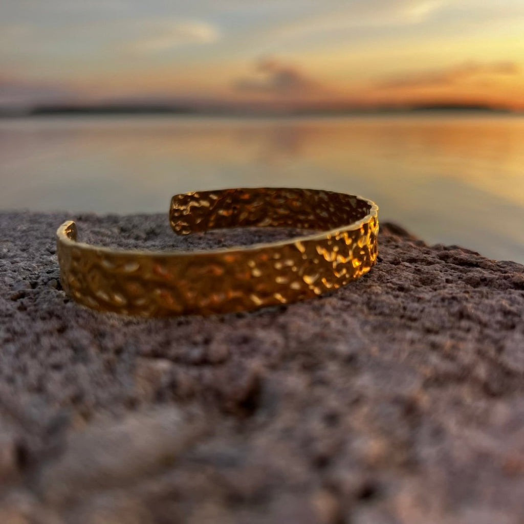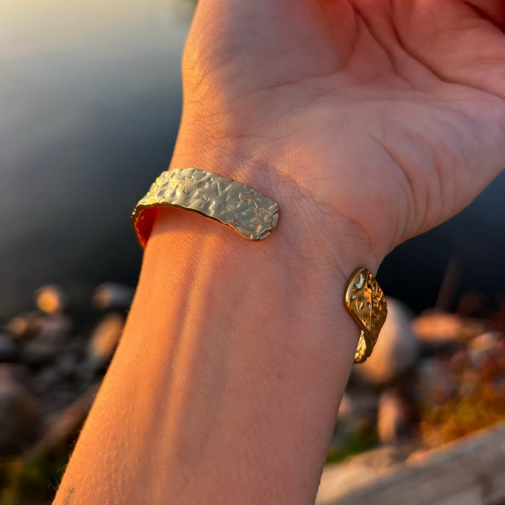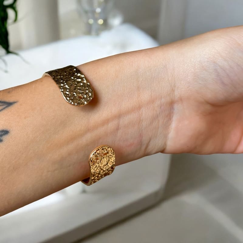 Ta drobno młotkowana regulowana bransoletka wyróżnia się delikatną teksturą, która nadaje jej unikalnego, artystycznego charakteru.