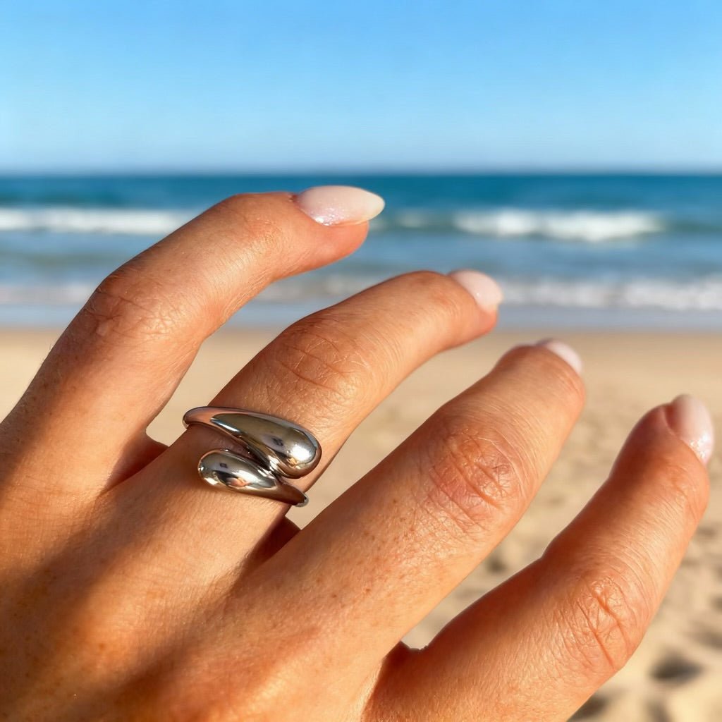 Srebrny pierścionek o unikalnym kształcie, przypominającym płynne linie, dodaje subtelnej elegancji i nowoczesnego stylu.