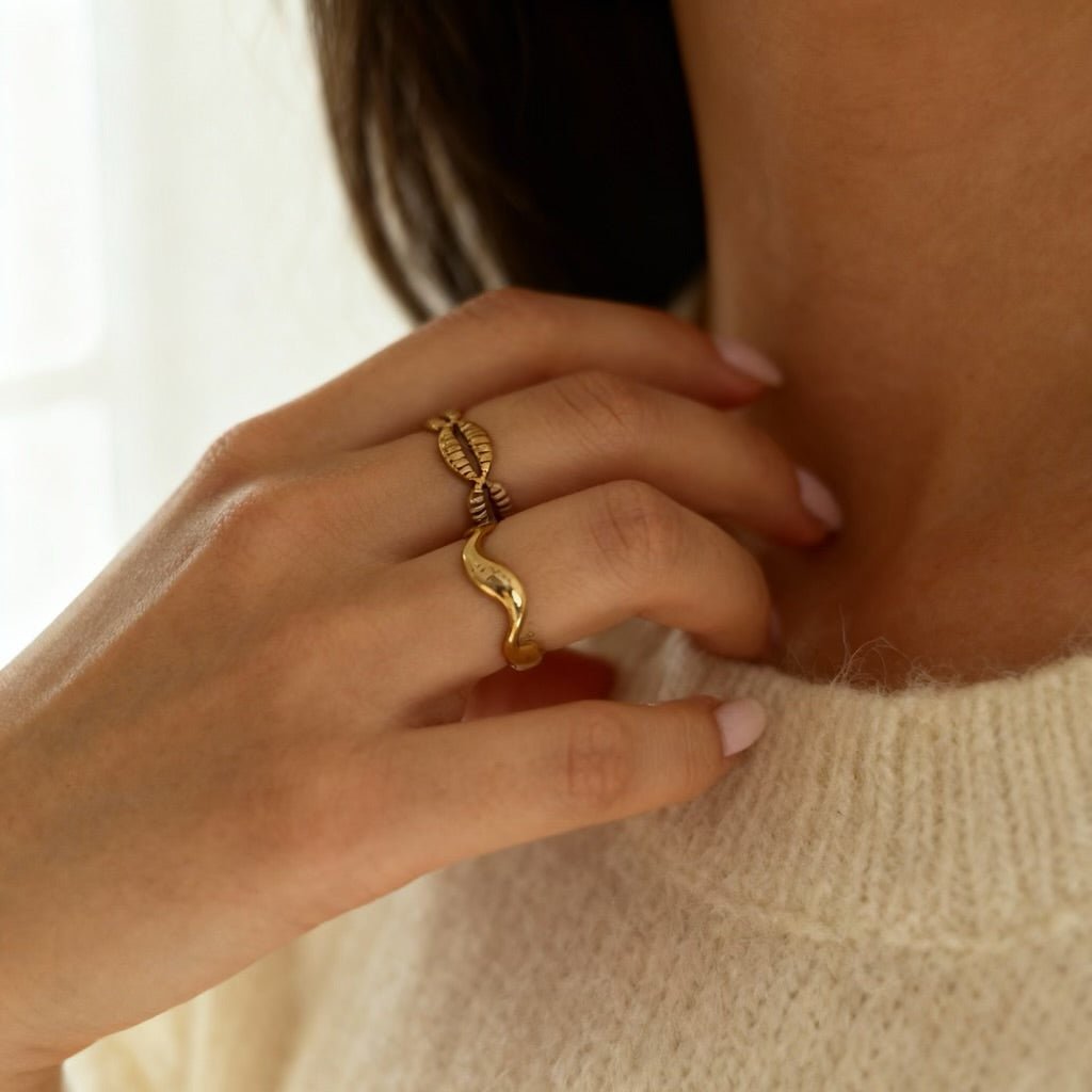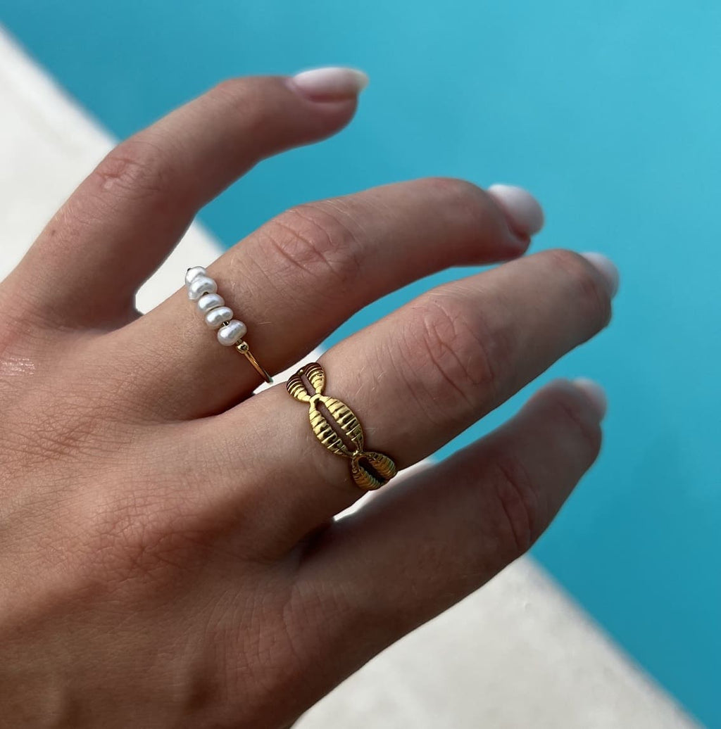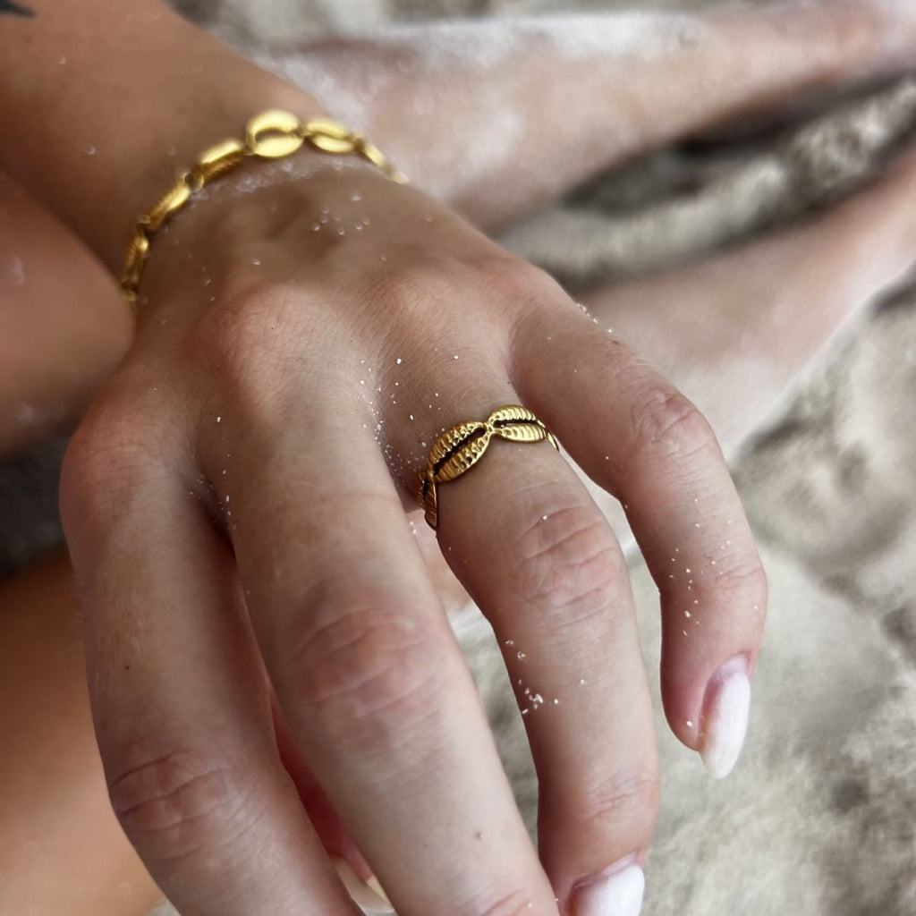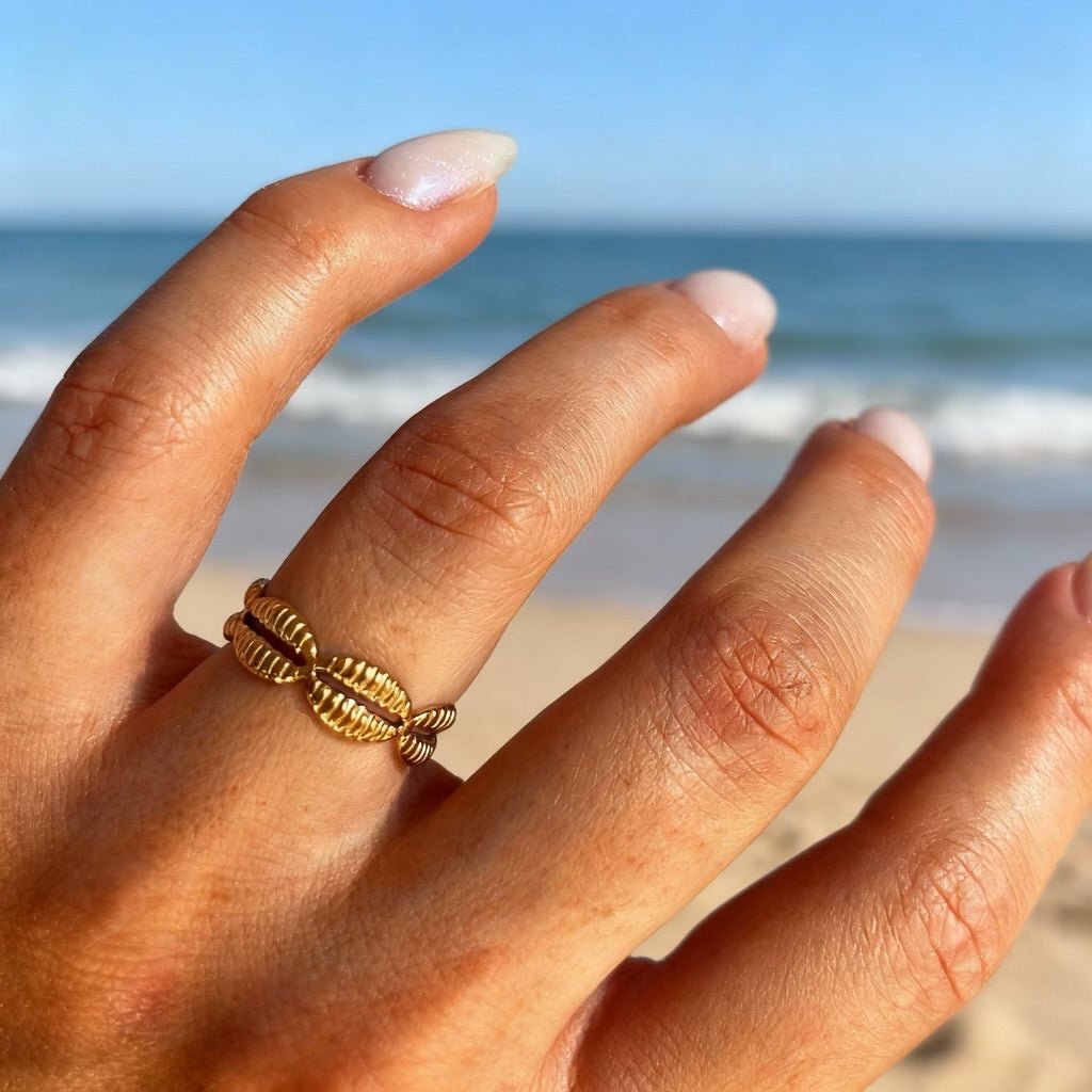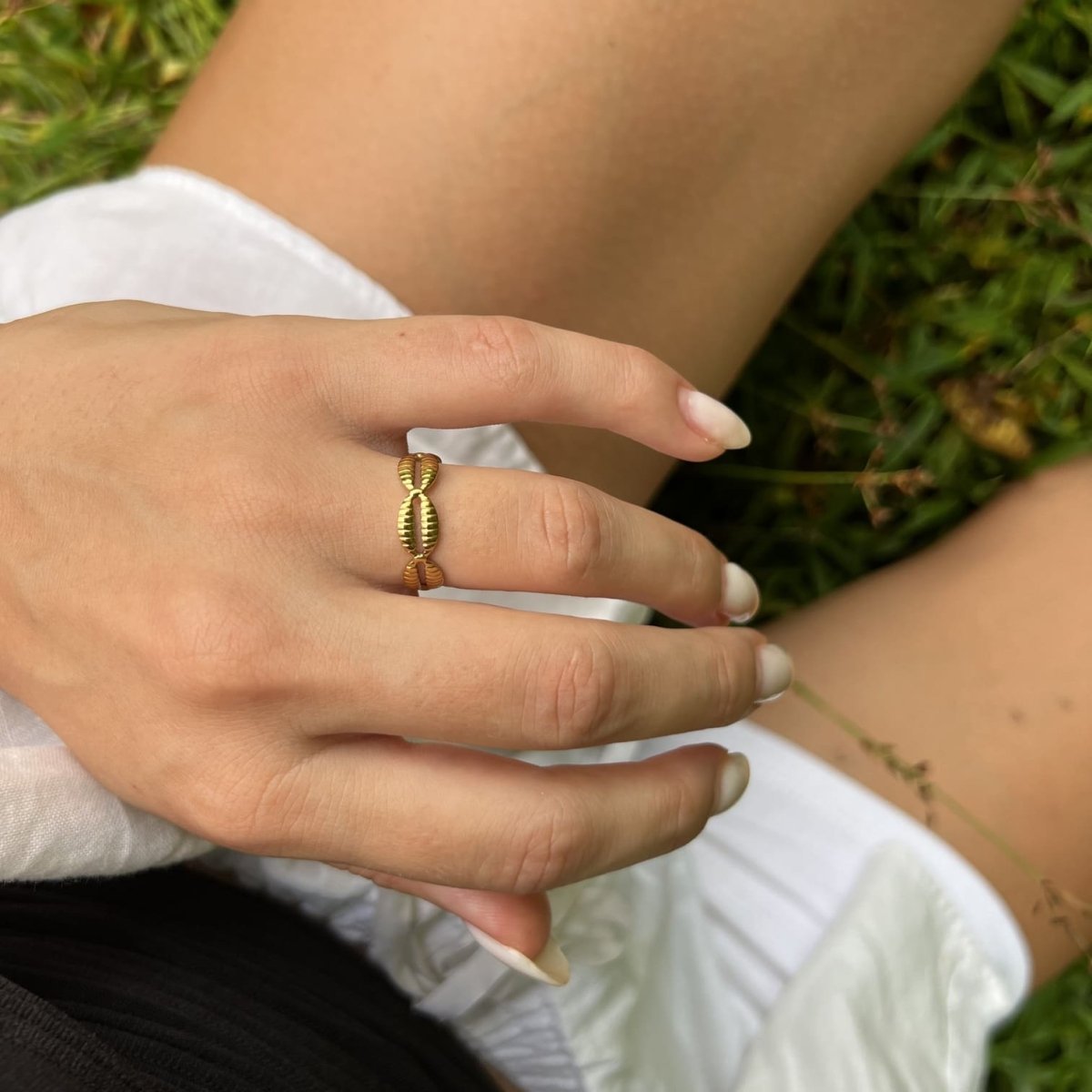 Złoty pierścionek ze stali szlachetnej, zdobiony delikatnymi muszelkami porcelankowymi.