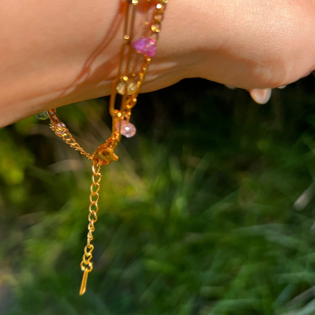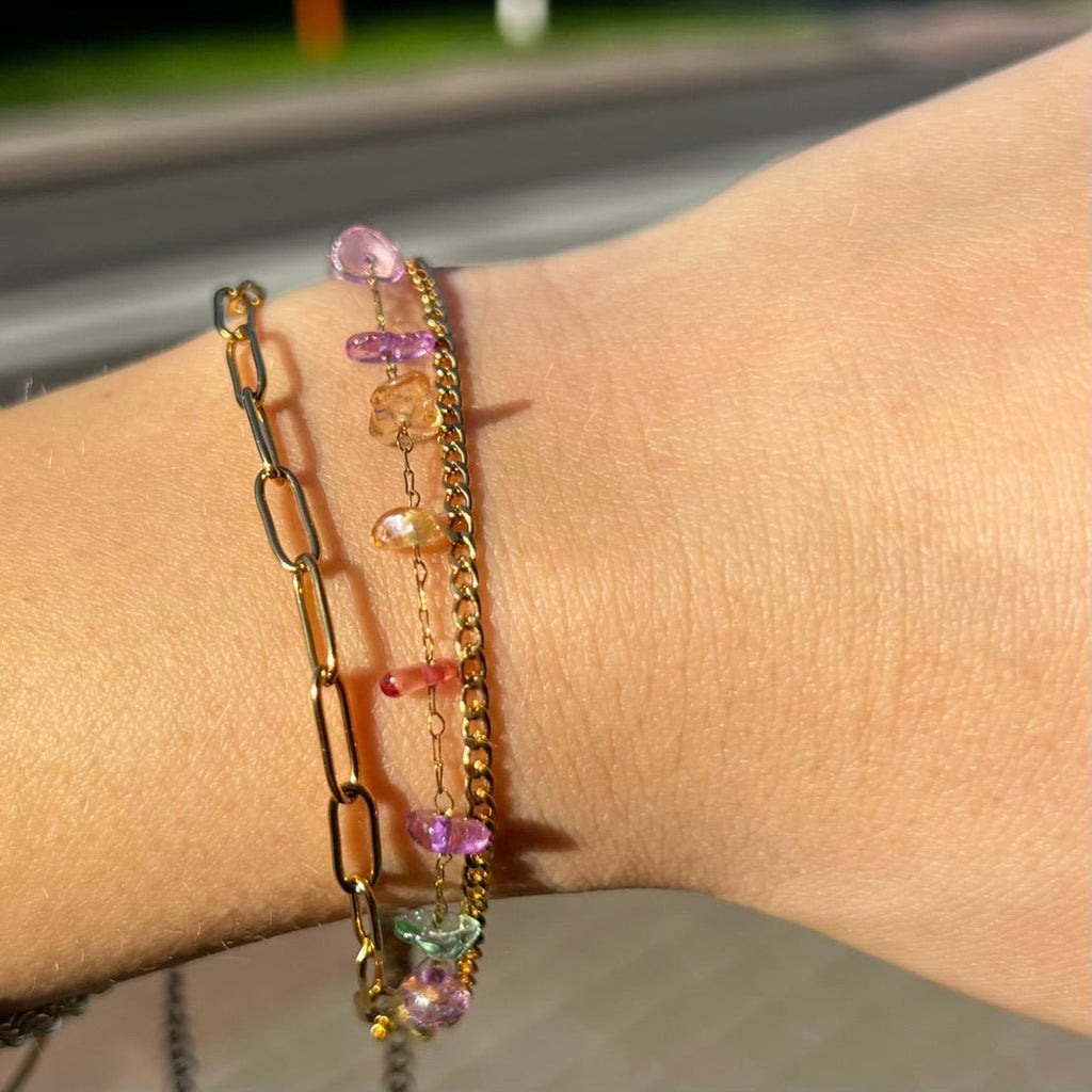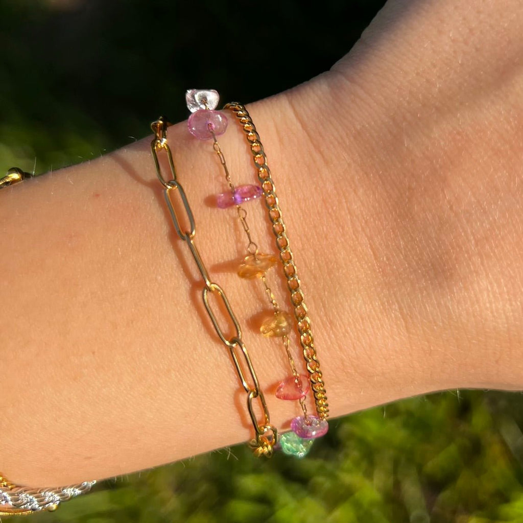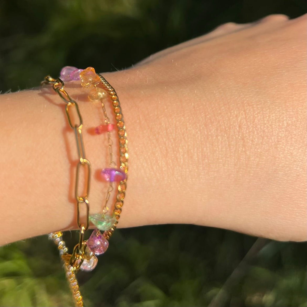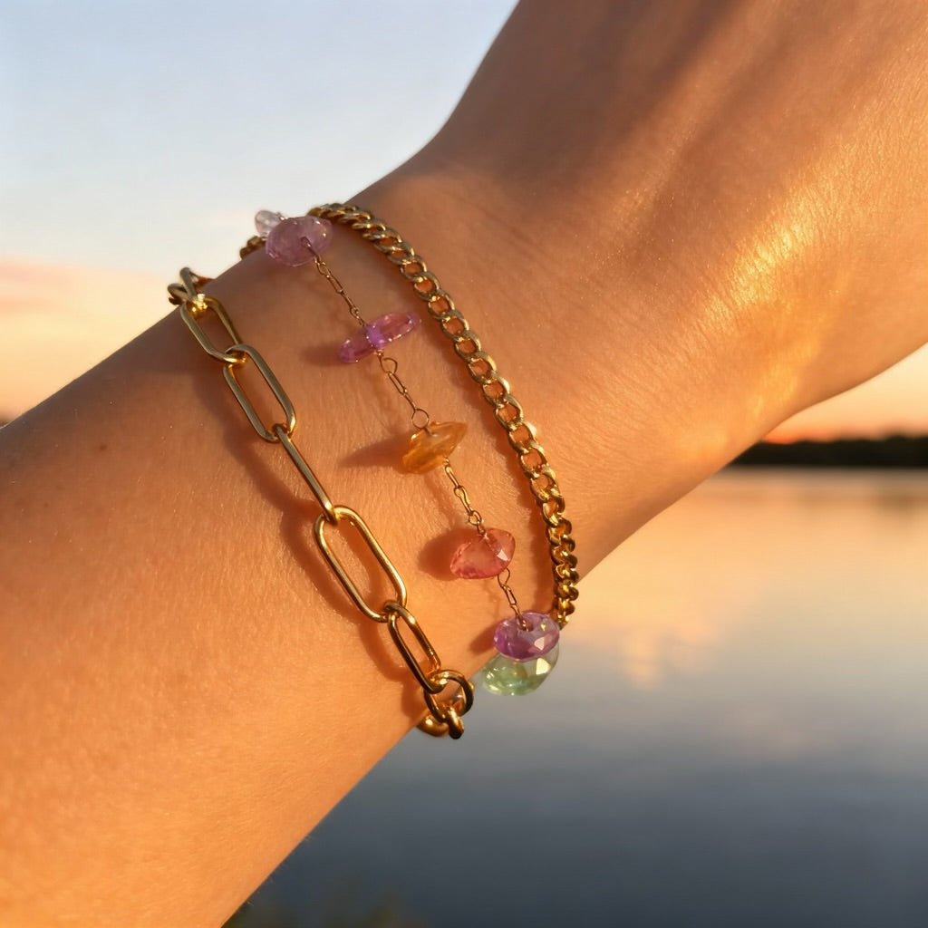 Bransoletka Siquijor to letnia eksplozja kolorów w eleganckim wydaniu. Połączenie delikatnych złotych łańcuszków ze stali szlachetnej z drobnymi, barwnymi koralikami tworzy efekt lekkości i radości – jak wspomnienie zachodów słońca nad tropikalną plażą. Różowe, zielone i pomarańczowe akcenty subtelnie mienią się w świetle, nadając stylizacji dziewczęcego uroku i pozytywnej energii.